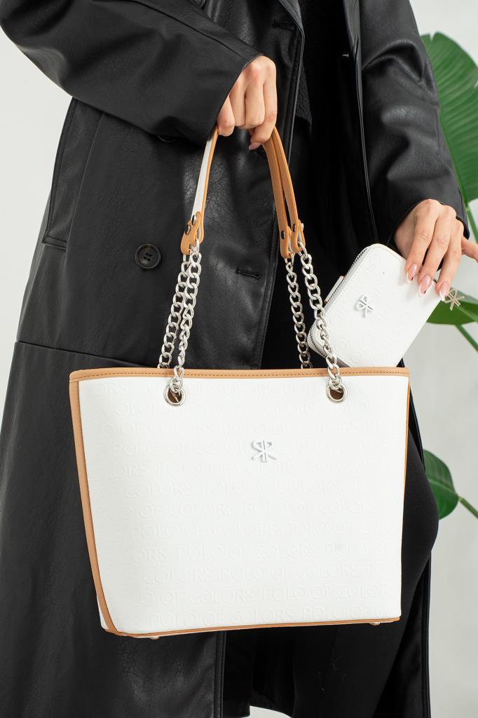 ImPolo Ida Nora Beyaz Kamel Kadın Omuz Çantası Kombin Çanta26X38 Cüzdan10x13